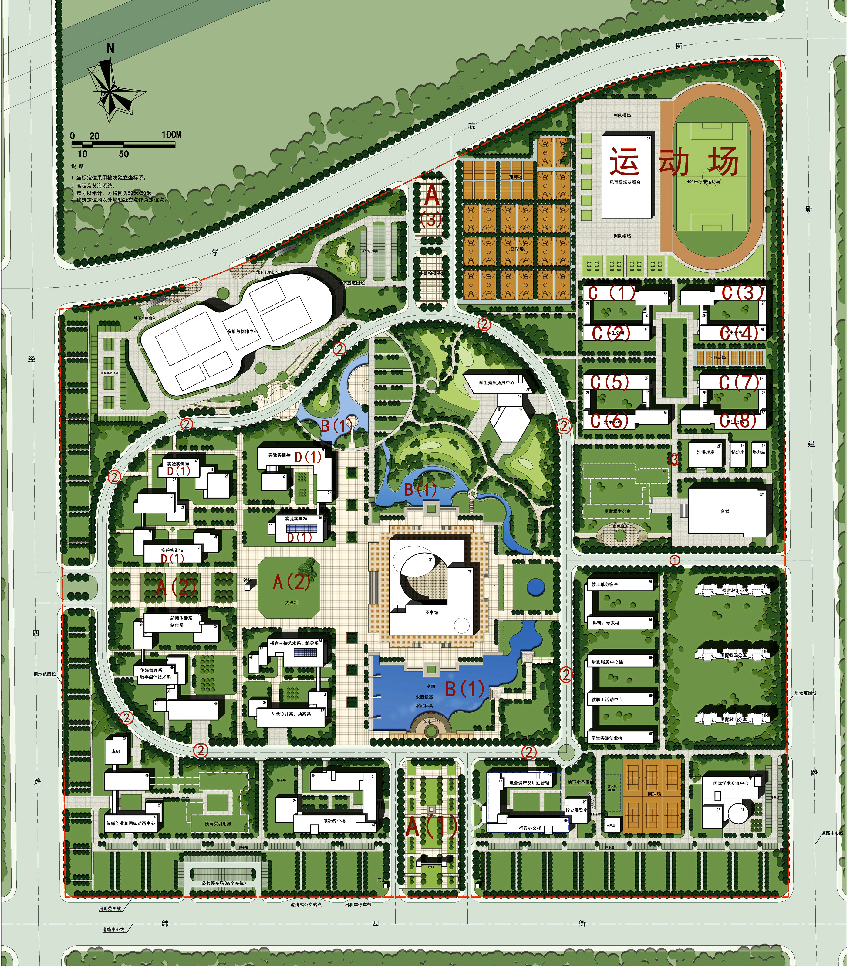 5、应征者在命名时需注意:道路、广场、人工湖视为一个单元进行系统命名;学生公寓楼视为一个单元进行系统命名;实验实训楼群及其他建筑视为一个单元进行系统命名。单独命名者不予采纳。投稿时写清相应字母、序号表示的道路或建筑物名称。(注:同一单元内的命名风格必须统一)