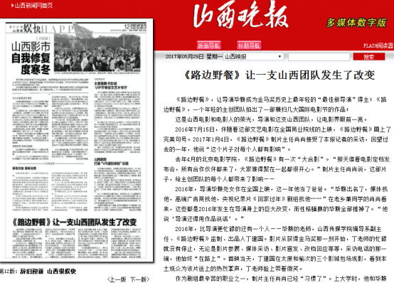 2017年1月7日,《山西晚报》第12版(辞旧迎新 山西很娱快)报道了我校2008级编导专业毕业生毕赣同学凭长篇处女作《路边野餐》获得第52届金马奖历史上最年轻的“最佳新导演”。这部由我校教师丁建国监制的作品于2016年7月15日在全国上映,此前已先后在第68届瑞士洛迦诺国际电影节、国际影评人费比西奖、第37届法国南特三大洲国际电影节、第12届中国独立影像展等多个国际国内电影节上获奖。