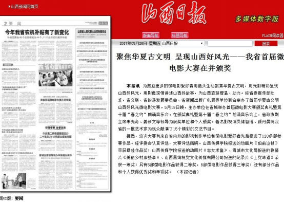2017年5月20日,《山西日报》第2版(要闻)报道了我校报送的动画作品在我省首届华夏古文明山西好风光微电影大赛获奖情况。其中,动画片《伯俞泣杖》荣获最佳作品奖,动画片《志女求鱼》荣获一等奖。据悉,本次大赛是经省委宣传部批准,省文联、省旅游发展委员会、省新闻出版广电局等单位联合举办,有来自省内外的影视制作单位和微电影爱好者先后报送了120多部参赛作品。