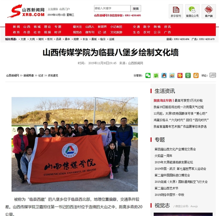 近日,山西新闻网、黄河电视台、《山西经济日报》等多家省内媒体对我校驻村工作队、驻村干部脱贫攻坚事迹进行了宣传报道。临县八堡乡西洼村第一书记卫霞,临县碛口镇马家洼村第一书记胡超峰,牢记职责使命,践行全心全意为人民服务宗旨,依托我校专业优势和人才优势,为当地绘制文化墙,拍摄纪录片,既营造了文明和谐的乡村文化,也为当地筹集到基础建设所需资金,赢得派驻地干部群众高度评价。