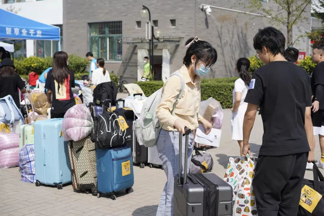 在融媒技术学院志愿者的陪同下,新生们从南门迎新点来到系楼,进行测量体温、检查报名材料等。报名完毕后,由志愿者将其行李搬运到宿舍楼下并带领新生办理入住手续。