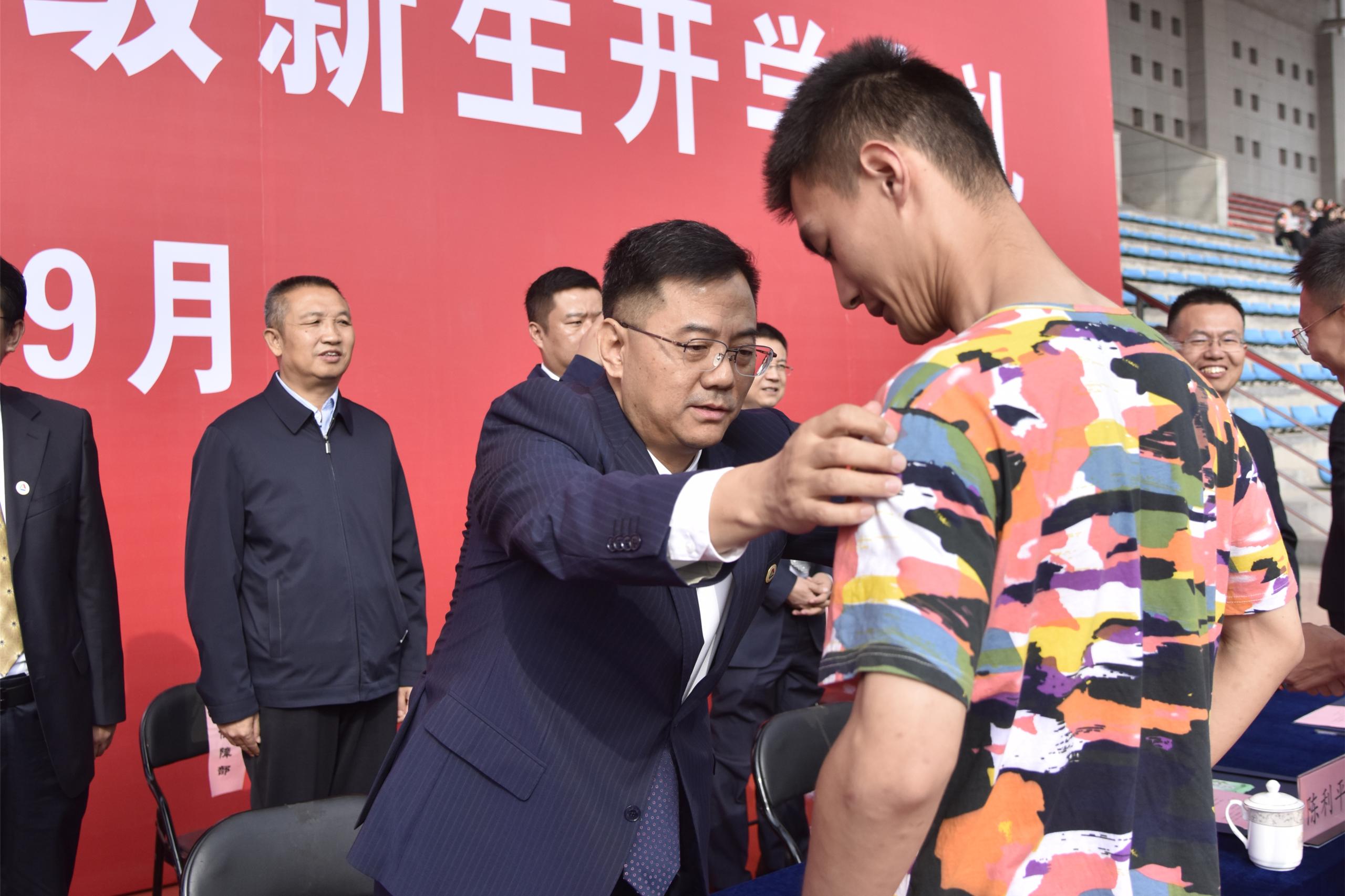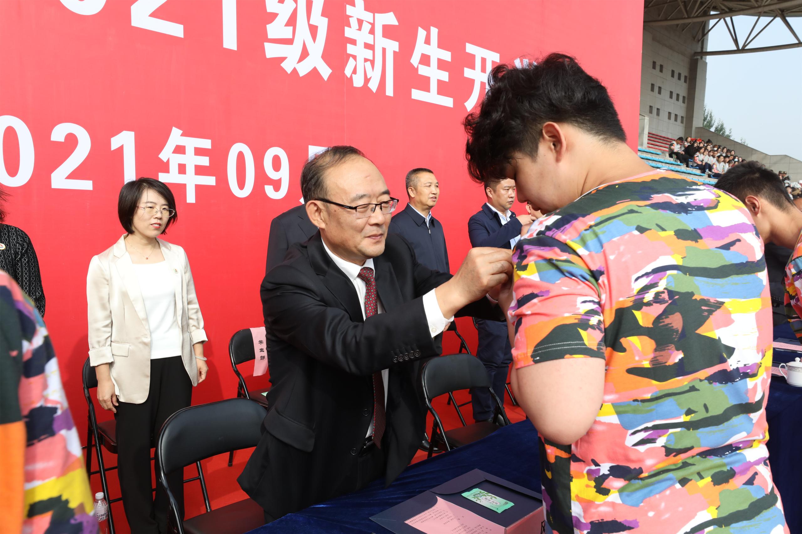 开学典礼在雄壮的国歌声中拉开帷幕,校领导为新生佩戴校徽。