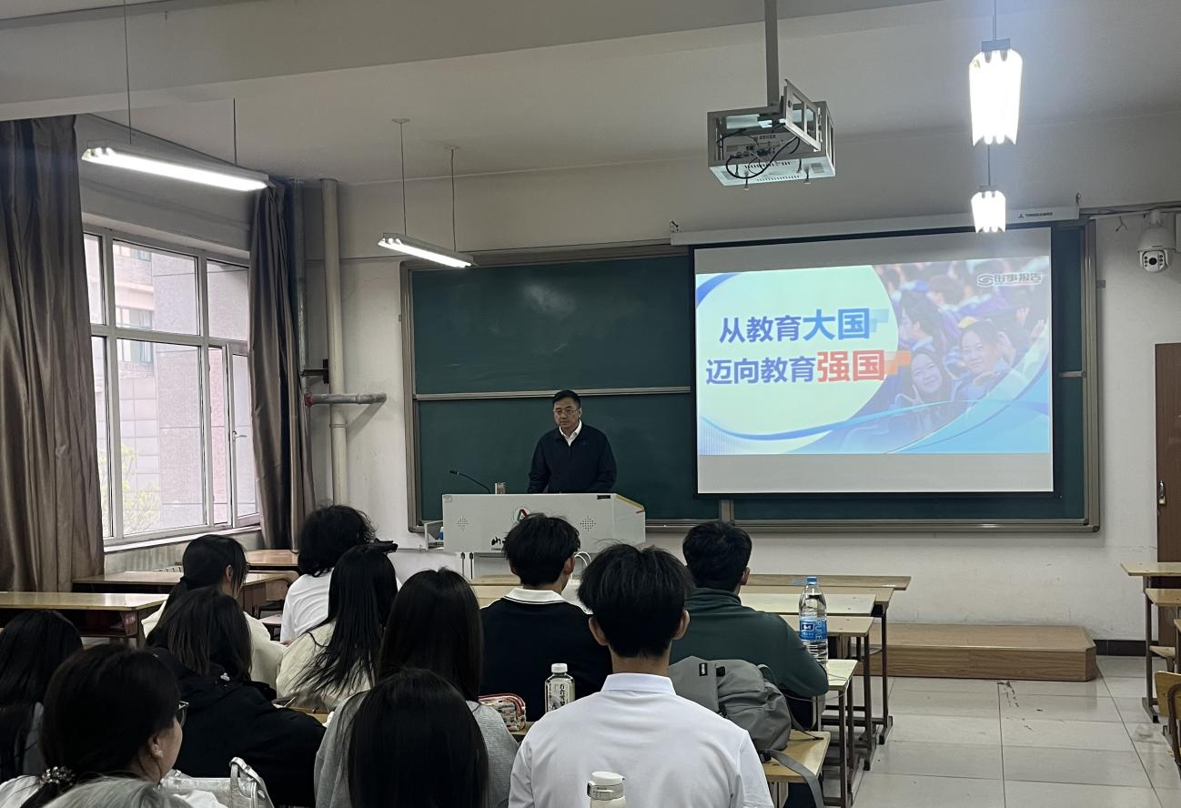 4月22日,党委副书记、校长李伟以“从教育大国迈向教育强国”为主题,给2023级播音4班和2023级广告设计与传播班的学生讲授了“形势与政策”课程。