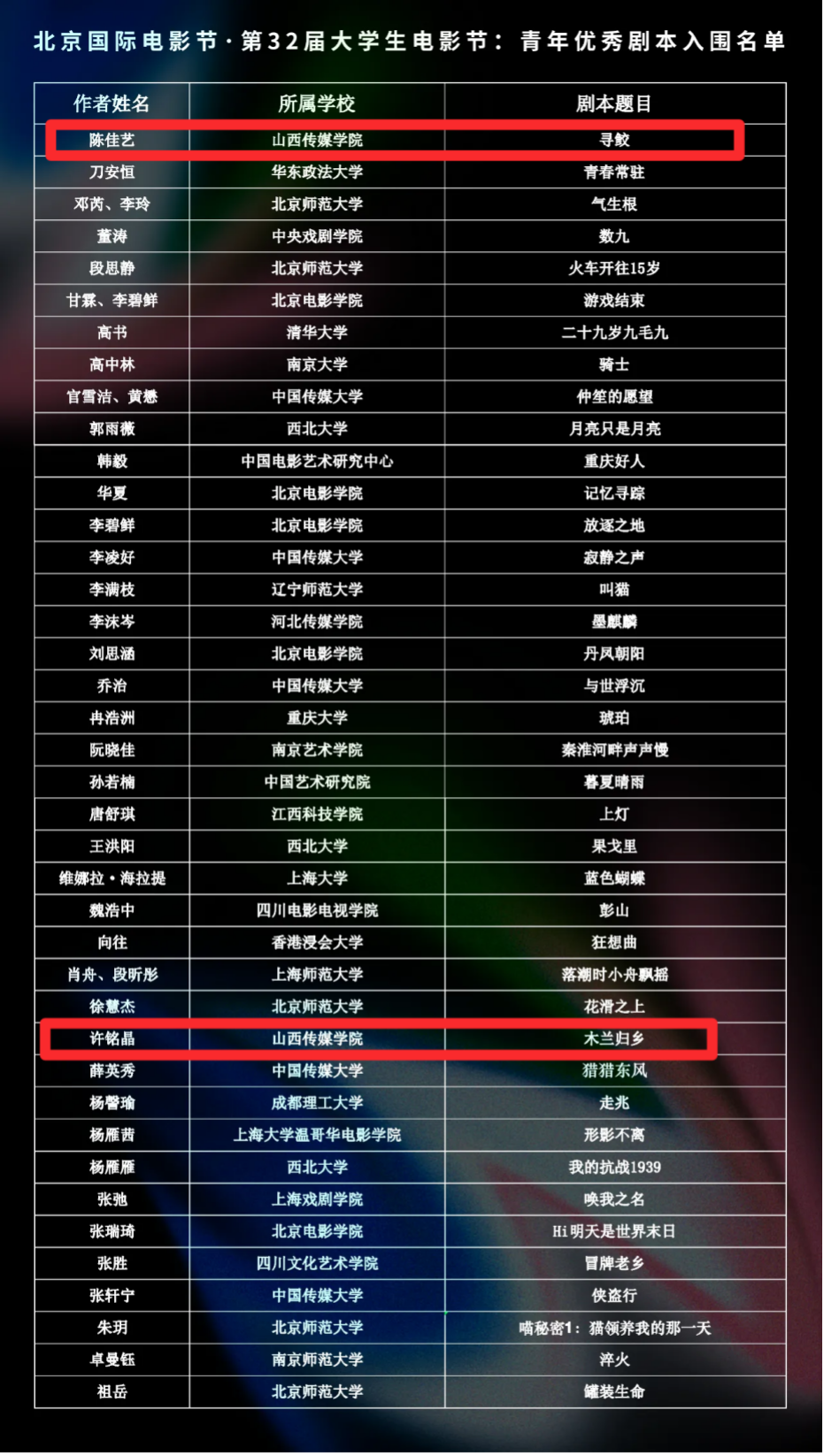 近日,北京国际电影节·第32届大学生电影节第十一届青年优秀剧本推选入选结果公布,2020级戏剧影视文学专业许铭晶同学的作品《木兰归乡》和2021级戏剧影视文学专业陈佳艺同学的作品《寻鲛》脱颖而出,成功入围。