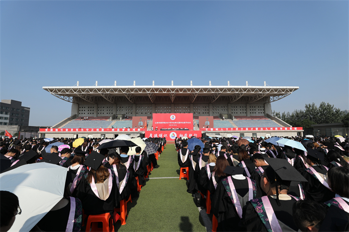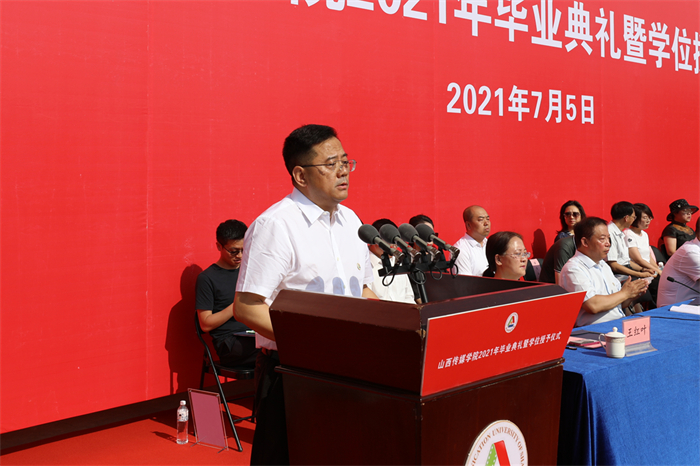 李伟代表学校向毕业生们送上热烈的祝贺,并作了题为《让青春在奋斗中绽放绚丽之花》的讲话。他讲到,大学青葱时光,你们每个人都在山传留下了美好的青春记忆。教学楼里的认真学习、图书馆里的静心阅读、实训室里的挥汗如雨,你们求知问学的身影成为了山传校园最靓丽的风景;创新创业大赛中的智慧交锋、运动赛场上的顽强拼搏、文艺汇演中的才艺展示,你们的精神气质让高等教育立德树人的旗帜更加鲜艳;抗疫斗争中的挺身而出、社会服务中的身体力行、毕业实习中的快速成长,你们的务实笃行彰显了山传学子“厚德博识、励学躬行”的校训精神!你们的毕业季,正逢中国共产党成立100周年,百年来,中国共产党人初心不改,从石库门到天安门,从兴业路到复兴路,坚定带领中国人民从站起来、富起来到强起来,实现第一个百年奋斗宏伟目标,创造了举世瞩目的光辉伟业。同学们正站在“两个一百年”奋斗目标的历史交汇点,第二个百年奋斗目标将在你们手上实现,你们建功立业的舞台空前广阔、梦想成真的前景空前光明。