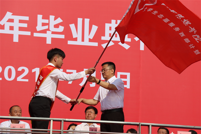 校长李伟向西部计划志愿者代表、动画与数字艺术学院王越宇同学授旗。