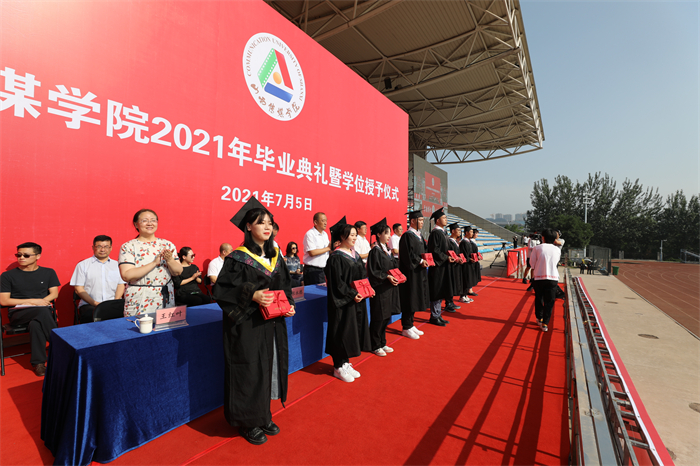 校领导为2021届优秀毕业生代表颁发荣誉证书,为毕业生代表颁发毕业证书。