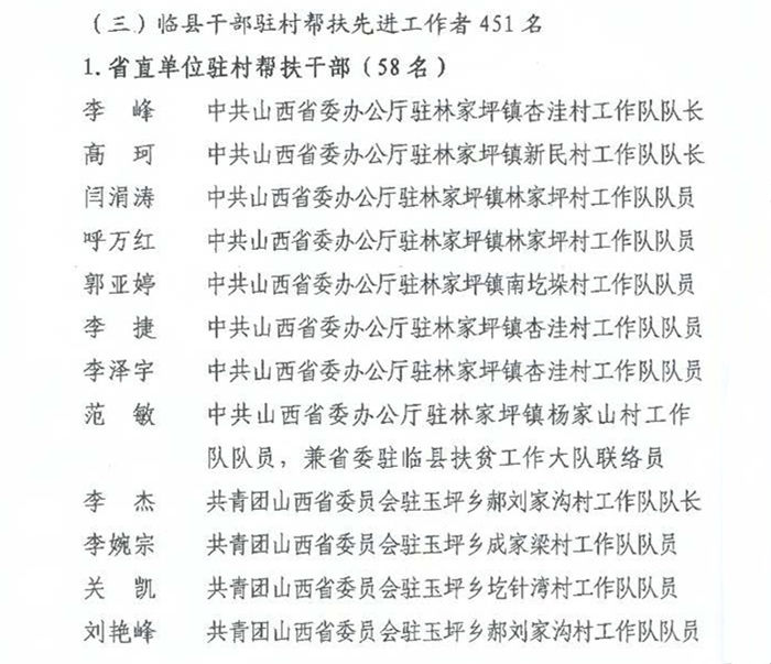 近日收临县县委县政府下发《关于表彰脱贫攻坚工作先进集体和先进个人的决定》。我校驻村帮扶工作队被授予脱贫攻坚先进集体称号,毛鹏杰、宋晓东、柴菲、赵健、胡超峰、薛辉、穆思睿、韩之阳等驻村帮扶干部被授予脱贫攻坚先进工作者称号。