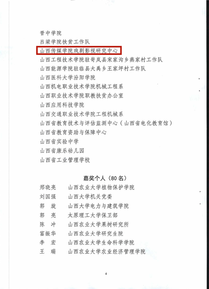 3月11日,山西省教育厅下发《山西教育厅关于给予所属事业单位工作人员和集体脱贫攻坚专项奖励的决定》(晋教人〔2021〕4号)文件,表彰了一批在脱贫攻坚中勇挑重担、无私奉献、事迹突出、群众公认的先进集体和个人。经严格推荐评选,决定给予我校戏剧影视研究中心集体嘉奖奖励,电影与电视学院胡超峰(临县碛口镇马家洼村党支部书记、驻村工作队长兼第一书记)同志个人嘉奖奖励。