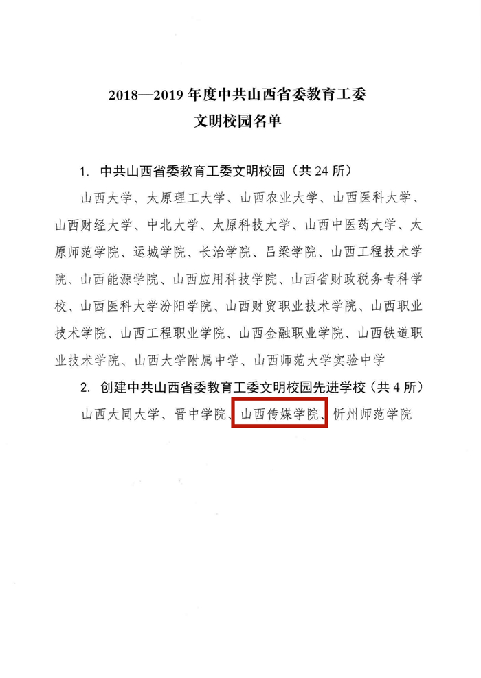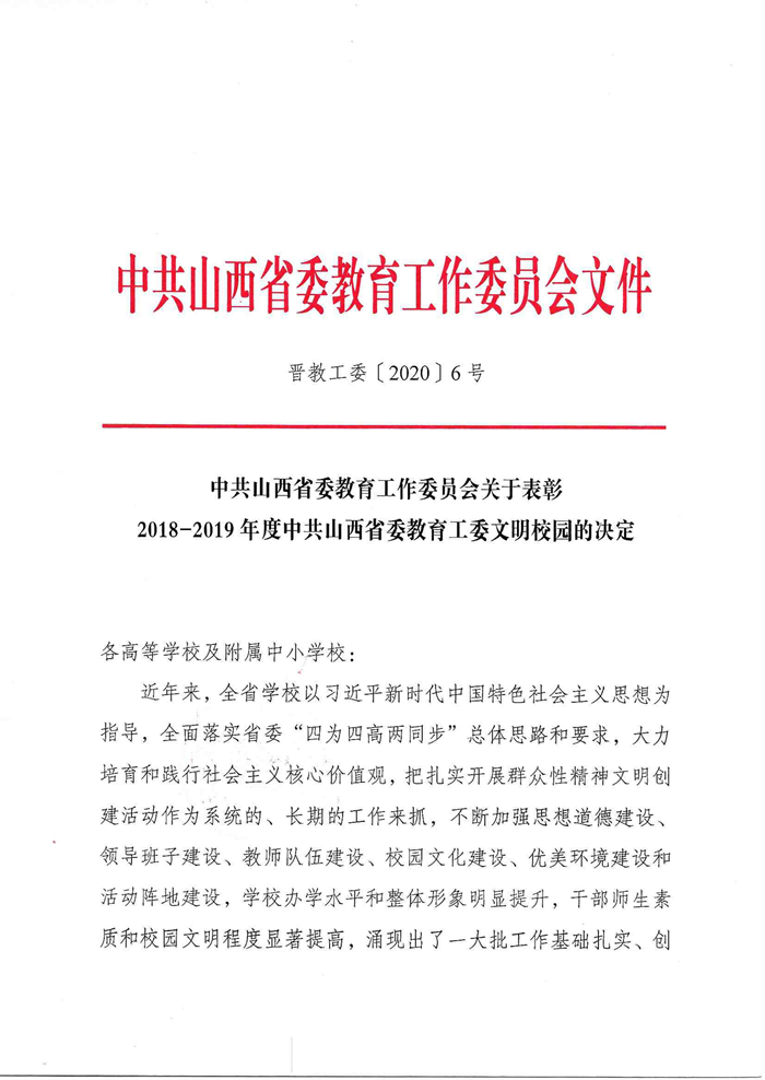 近日,中共山西省委教育工委下发《中共山西省委教育工作委员会关于表彰2018-2019年度中共山西省委教育工委文明校园的决定》(晋教工委〔2020〕6号)文件,表彰了一批精神文明建设先进高校,我校名列其中,荣获“创建中共山西省委教育工委文明校园先进学校”称号。