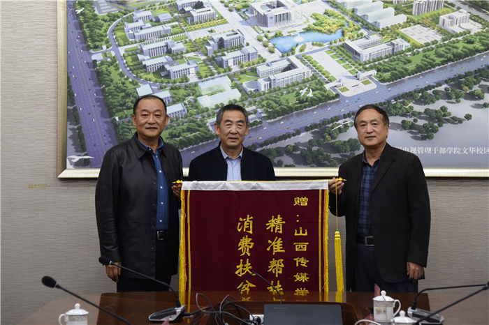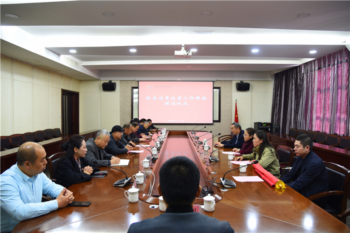 11月11日上午,我校举行临县消费扶贫工作锦旗赠送仪式。临县农业农村局副局长郭永明一行4人向学校赠送锦旗,感谢我校为当地经济发展做出的贡献。党委副书记刘锐、副院长武升平出席,组织部、后勤处负责人及各党总支书记参加仪式。