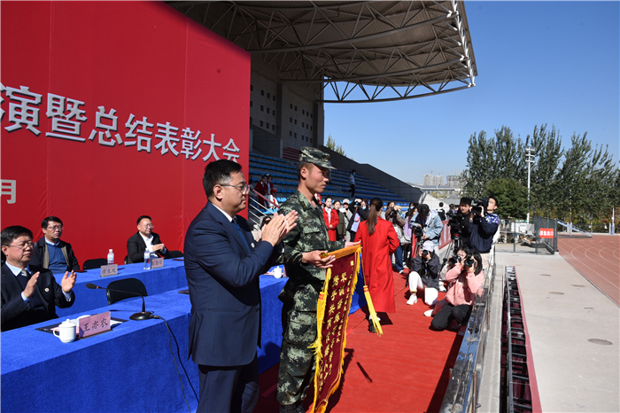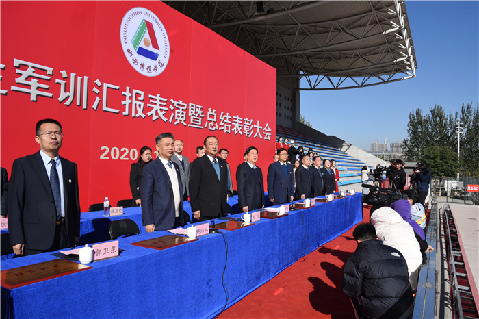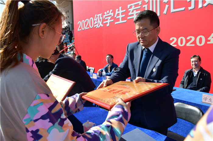 军训汇报表演在20级新生嘹亮的军歌声中结束,党委副书记陈利平宣读了《关于表彰2020级学生军训先进集体、先进个人的决定》。校领导为获奖先进集体代表颁奖。