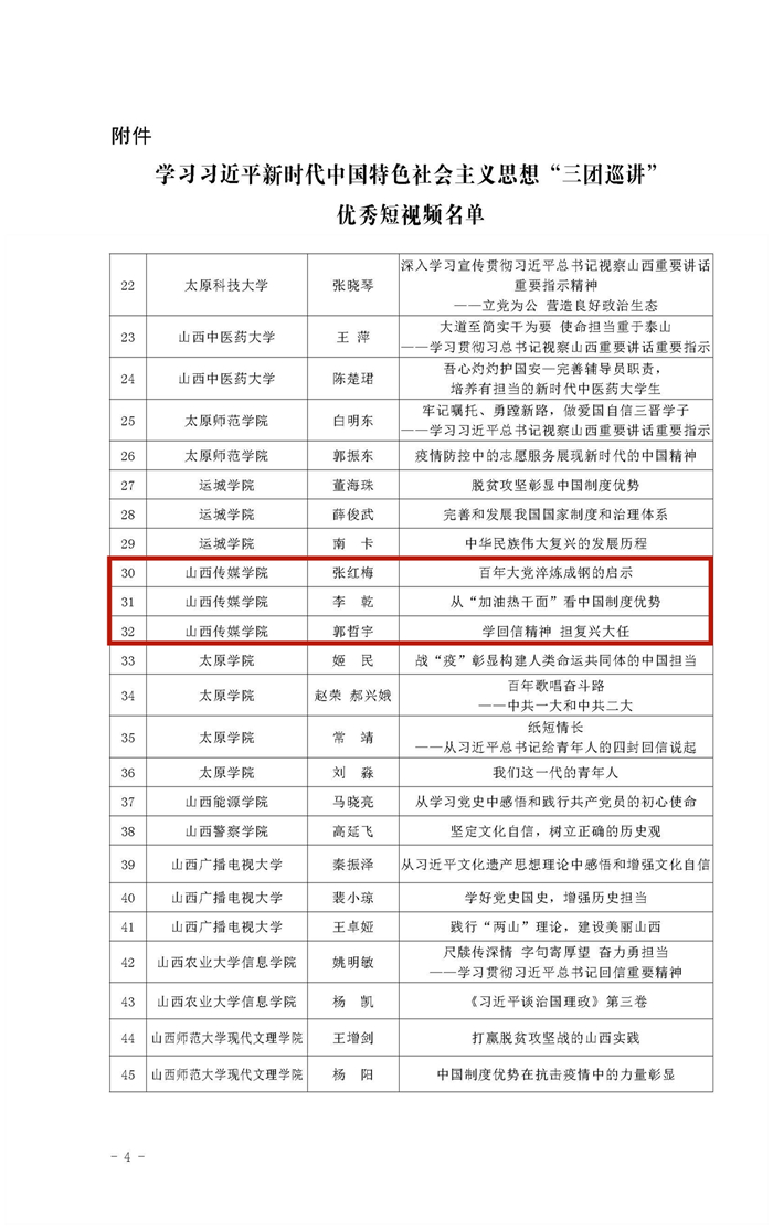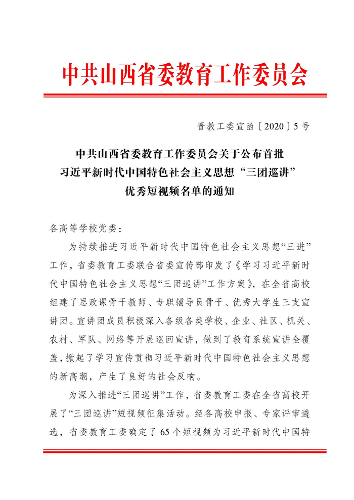 经省委教育工委专家评审遴选,我校思政部教师张红梅、动画与数字艺术学院专职辅导员李乾、播音主持学院学生郭哲宇录制的三部宣讲短视频被评为山西省高校首批习近平新时代中国特色社会主义思想“三团巡讲”优秀短视频。