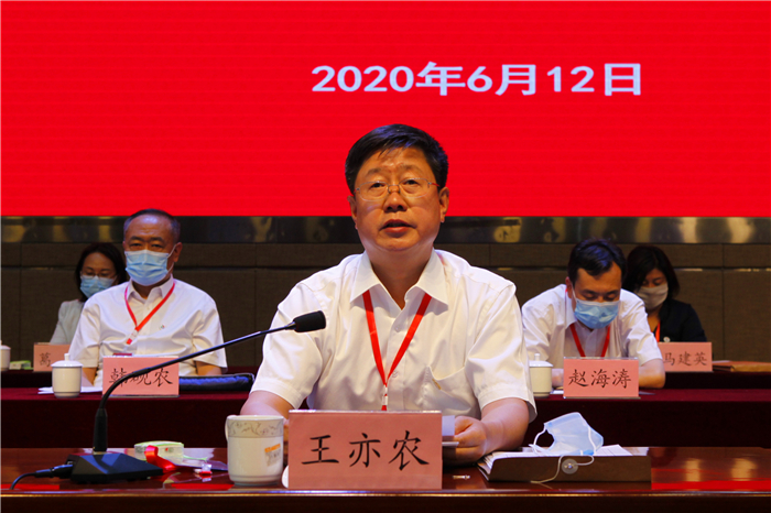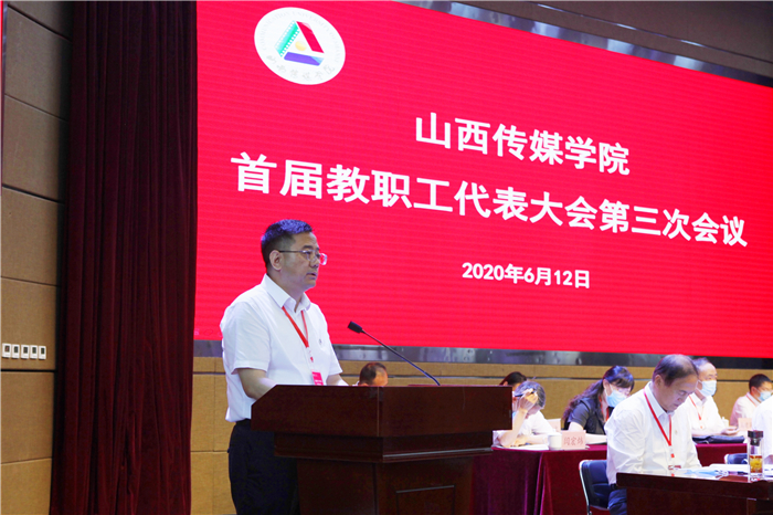 党委书记王亦农在大会上作了题为《加强党的领导,打赢三场硬仗 奋力推进特色鲜明、行业一流的高水平应用型传媒学院建设》的总结讲话。他指出,在全国疫情防控阻击战取得重大战略成果,全国各地统筹做好常态化疫情防控和复工复产复学之际,山西传媒学院首届教代会第三次会议顺利举行。这是学校发展史上的一件大事,也是全校教职工政治生活中的一件大事。在这个特殊时期召开这次大会,必将对进一步学习贯彻习近平新时代中国特色社会主义思想和党的十九届四中全会精神,统一教职工思想、凝聚教职工力量,发扬教职工主人翁精神,加快建设特色鲜明、行业一流的高水平应用型传媒学院起到积极的推动作用。他就做好2020年度重点工作任务提出要求:第一,强化党建引领,加强党的全面领导。第二,坚持结果导向,坚决打赢三场硬仗。第三,充分发挥优势,凝聚起强大的发展合力。他号召全校师生员工紧密团结在以习近平同志为核心的党中央周围,认真贯彻省委“四为四高两同步”的总体思路和要求,坚定为党育人、为国育才的初心使命,凝心聚力、真抓实干,奋力推进特色鲜明、行业一流的高水平应用型传媒学院建设,共同谱写山传发展新篇章。