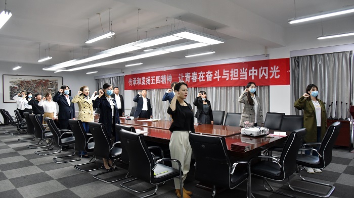 上午10点, 参加本次纪念座谈活动的团员青年在校团委书记杨志鹏的带领下,高举右手,重温入团誓言,青春告白祖国。