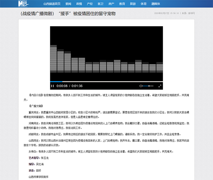 2月27日,新华网刊播我校电影与电视学院师生原创的广播微剧《援手》。故事取材于新浪微博熊小墨在2020年1月27日发布的一条消息,主要讲述了疫情防控期间,被无法按时返回工作和生活城市的主人滞留在家的宠物们无人看管,在这困难时期,互不相识的陌生人伸出援助之手,帮忙照顾宠物的温情故事。