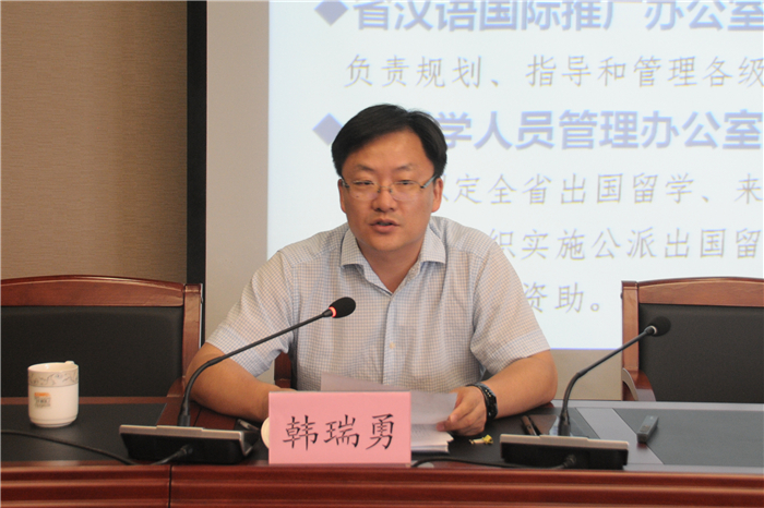 韩瑞勇介绍了我国和我省留学工作发展的历史沿革,传达了全国留学工作会议、全国教育大会、习近平总书记视察山西重要讲话精神及全省教育大会精神中国际化工作的要求,并就公派出国留学人员选派管理相关政策进行了详细解读。