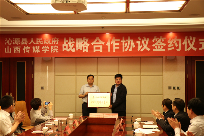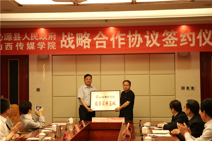 沁源县副县长李建萍代表县政府与郭卫东签订战略合作协议。李伟分别向新时代文明实践中心和融媒体中心授予“教学实践基地”“沁源文创孵化基地”牌匾。