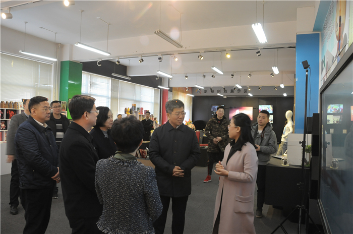 王成禹一行在党委书记王亦农和党委副书记、院长李伟陪同下走访了文化科技园、艺术设计系、辅导员工作室,浏览了我校融合媒体创新研究中心建设完成的山西省爱国主义教育基地全景展馆,了解了相关文化展示应用项目情况,在艺术设计系和辅导员工作室同辅导员深入交流,了解辅导员队伍现状和工作中遇到的问题和困难。