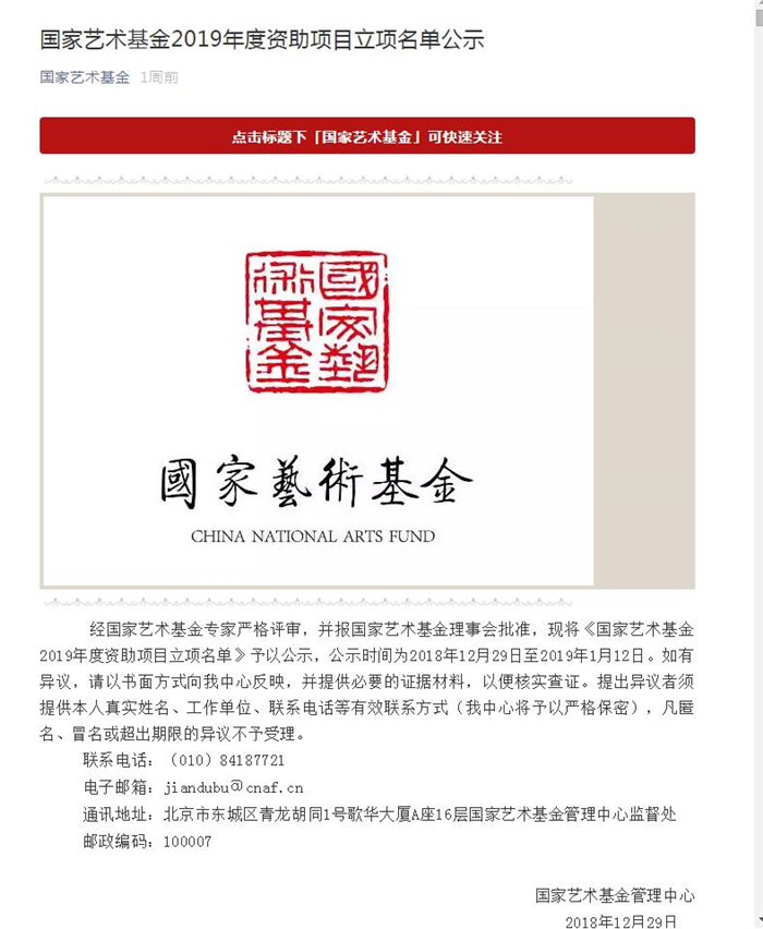 国家艺术基金(英文名称为China National Arts Fund,英文缩写为CNAF)是为繁荣发展艺术事业,经国务院批准设立的。据悉,2019年度国家艺术基金资助项目共立项1100项,小型剧(节)目和作品创作项目立项资助227项。