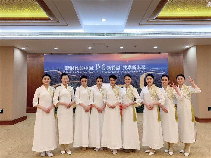 在这场国际盛事中,我校播音主持学院2016级学生张靖苑、寇美琪、杨丽平,2017级马嘉敏、王前、渠翔清,2018级赵小扉,新闻传播学院2018级学生朱紫尘、项淑琳,动画学院2018级学生李香珏等10名同学,作为本次盛会的志愿者,经过了为期十五天的训练,通过了国际礼仪、冷餐服务、商务英语、形体体态等多项考核,在层层选拔中脱颖而出,代表我校,更是代表山西大学生,在蓝厅向世界展示山西形象。