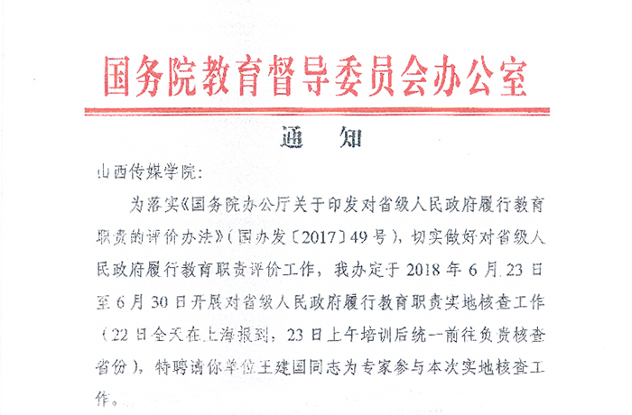 6月23日至6月30日,国务院教育督导委员会派出32个核查组,对31个省(区、市)省级人民政府和新疆生产建设兵团履行教育职责情况进行评价,院长王建国作为特聘专家参与了本次实地核查工作。