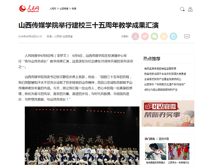 近日,新华网、人民网对我校建校35周年庆典暨教学成果汇演进行了宣传报道。6月6日,为庆祝建校35周年,我校举办了建校35周年庆典暨教学成果汇演。近年来,我校在人才引进、平台建设、实践教学、国际交流、内涵建设等方面取得了一系列成果,这既是对学校过去发展的肯定也是推动学校在新时代、新征程中砥砺奋进的动力。