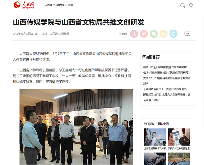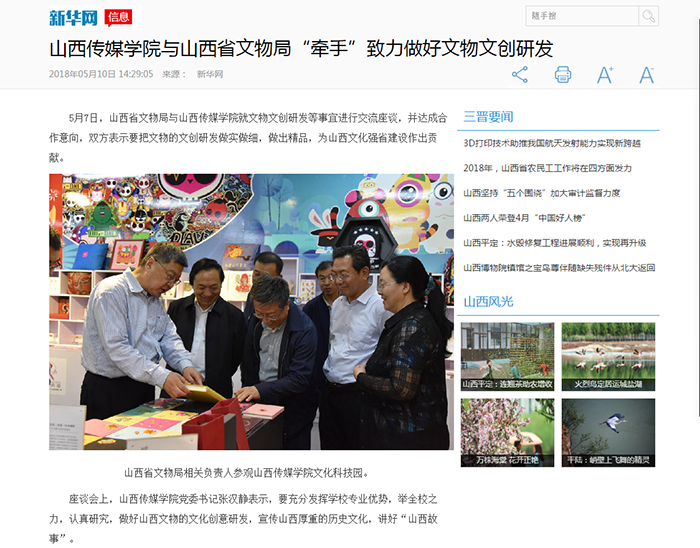 近日,新华网、人民网分别以《山西传媒学院与山西省文物局“牵手”致力做好文物文创研发》《山西传媒学院与山西省文物局共推文创研发》为题,对我校主动对接省文物局开展文物文创研发进行了宣传报道。