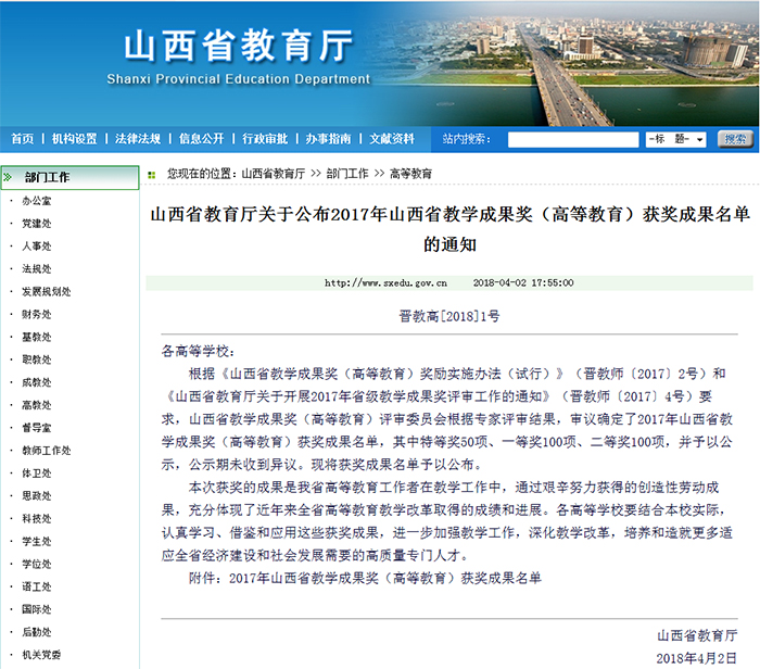 近日,山西省教育厅公布了“2017年山西省教学成果奖(高等教育)”获奖名单,我校推荐申报的教学成果荣获特等奖2项,一等奖1项,二等奖1项。由覃晓燕、王建国、郭卫东、黎贯宇、李何、孙昊琛完成的《应用型高校大学生创新创业基地建设研究——以山西传媒学院大学生创新创业基地建设研究为例》、由申明远、孙立军、史彤、杜娟完成的《品牌规划与设计课程教学体系探索与实践》两项成果获特等奖,由郭卫东、刘朝霞、伊文臣、文红、鄢睿完成的《传媒类专业人才培养体系建设与实践》获一等奖,由温建梅、马臻宇、杜君、孟威、张肖艳完成的《应用型本科影视摄影与制作专业人才培养方案的探索与实践》获二等奖。