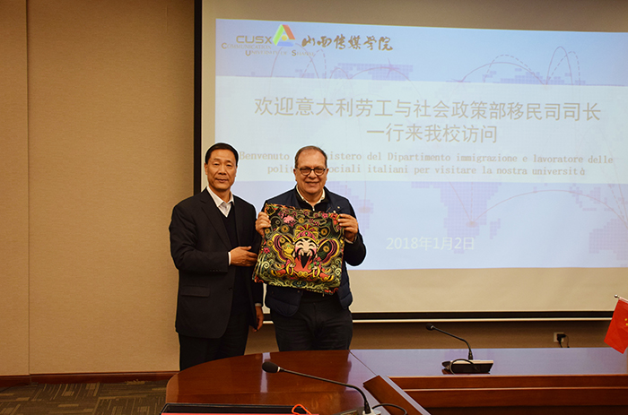 1月2日,意大利劳工与社会政策部移民总司司长罗多尔弗·乔智迪先生、外联处处长安娜丽达·瑰迪女士士、中意青年会副会长、中意妇女联谊会会长王红霞女士一行三人,在山西省外事侨务信息中心科长薛晓华和山西蓝晨影视文化有限公司总经理赵华女士的陪同下来我校访问。学校举行了欢迎座谈会,院长王建国、副院长王红叶、教务处、科研处、影视制作中心、纪检监察室、国际交流合作处、导演系等有关部门负责人参加,座谈会由王红叶副院长主持。