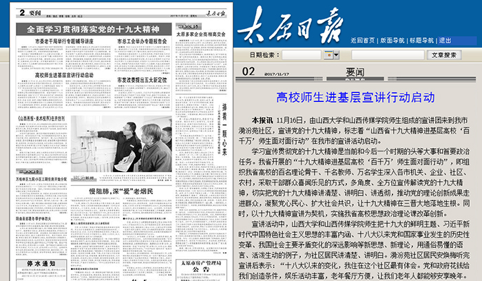 11月17日,《太原日报》(2版要闻)以《高校师生进基层宣讲行动启动》为题对我院师生进基层宣讲党的十九大精神进行宣传报道。现将新闻全文转载如下: