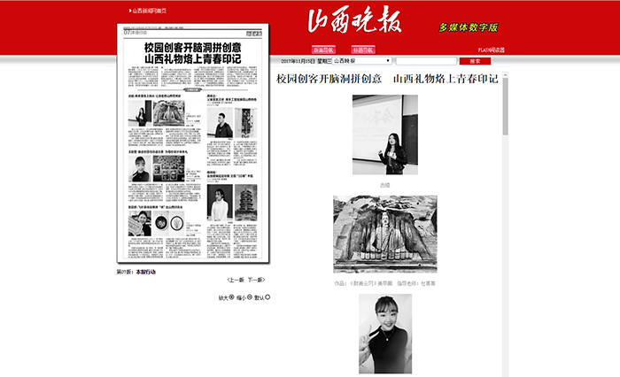 我院师生所递交的作品得到主办方的专业认可,主办方从中选出具有代表性、贴近大赛主题性的作品,在《山西晚报》作了整版专题报道。