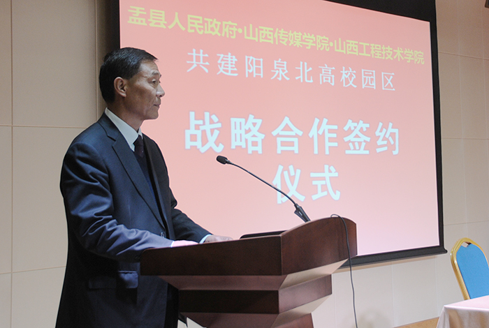 王建国院长作了讲话。他指出,近年来,我院高度重视校地合作,将校地合作确立为学院开放办学的一项重要举措,将其列入重要议事日程,全局统筹,稳固推进。特别是学院第一次党代会以来,进一步明晰办学思路,确定奋斗目标,将“突出融合、突出创新”明确为办学理念的重要内容,深入推进产教融合,创新发展。盂县是我省的资源大县、经济大县,交通地理位置优越,历史文化资源丰富,特别是盂县县委、县政府绘就的城市发展规划、路网规划、一区两园规划、全域旅游规划等“四张蓝图”,与山西传媒学院的发展要求是契合的,这更增强了我们合作办学的信心,我们将以此次战略合作协议的签订为契机,进一步抢抓机遇,科学谋划,把深化校地合作办学摆在更加突出的位置。充分挖掘双方合作的新优势新特色,提高服务阳泉市地方经济的能力和水平;进一步建立良好的合作机制,精准发力,以抓铁有痕、踏石留印的作风,扎实有效地推进合作办学相关工作,努力提升合作层次和水平。今天的签约必将成为双方合作的一个良好开端,只要双方共同努力、携手奋进,一定能在盂县这块创新创业的热土上续写新的篇章。