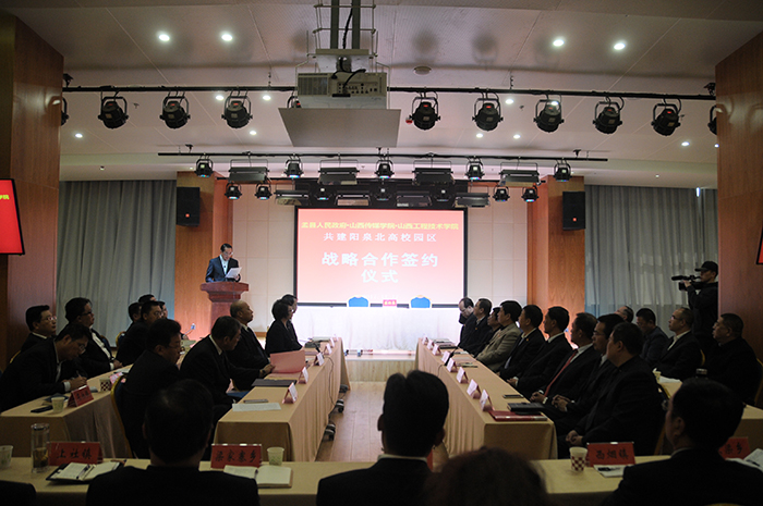 11月17日上午,我院同山西工程技术学院、盂县人民政府共建阳泉北高校园区战略合作签约仪式在盂县文化中心举行。阳泉市委副书记、盂县县委书记李云峰,盂县县委常委、常务副县长王建华、盂县政协副主席王红雁,山西工程技术学院领导韩保清,卫英慧,王玉清,郑捧柱,我院院长王建国,党委副书记刘锐,副院长郭卫东等出席。签约仪式由盂县人大常委会主任武润珍主持。