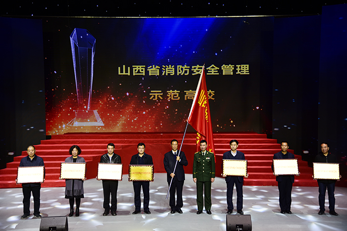 山西省公安消防总队总队长王勇向我院授予了“山西省消防安全管理示范高校”红旗,向太原理工大学、山西医科大学、山西中医药大学、山西能源学院、太原师范学院、晋中学院、山西交通职业技术学院、山西建筑职业技术学院、山西职工医学院等9所高校授予“山西省消防安全管理先进高校”牌匾。