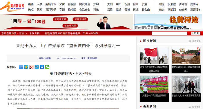 10月1日,黄河新闻网山西新闻板块以《喜迎党的十九大 山西传媒学院"望长城内外"系列报道之一》为题,对我校新闻传播学院举办的卓越新闻传播人才培养计划实验班2017暑期“望长城内外”社会实践活动的成果进行了系列宣传报道。《黄河新闻网》将通过系列报道的形式,向大家集中展示卓越新闻传播人才培养计划实验班同学们的暑期实践成果,为党的十九大胜利召开营造良好舆论环境。