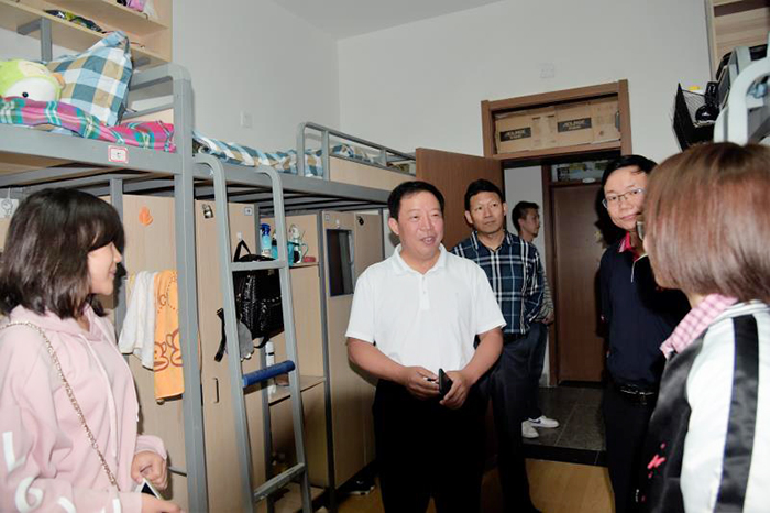 张永德副校长认真察看宿舍生活设施是否完备、宿舍内外是否有安全隐患、环境卫生保洁落实工作情况,要求相关部门认真做好宿舍安全检查工作,并对防火、防盗以及人身安全等方面提出了具体要求。他要求公寓管理员要做到细心、耐心,尽量满足新生的生活需要。他还走进学生宿舍与新生亲切交谈,询问大家到校后的感受以及生活需要,询问他们的饮食、气候、住宿等方面的适应情况,嘱咐同学们要多注意身体。他希望同学们把学校当做一个大家庭,能够相互关照,加强沟通交流,增进彼此之间的感情。同时,张永德副校长也提醒同学们要提高自我保护意识和防范意识,以免上当受骗。最后,张永德副校长对同学们提出了殷切的期望,要求同学们树立远大理想,做好大学学习生活规划,不断提升自身综合素质,不辜负大学美好时光。