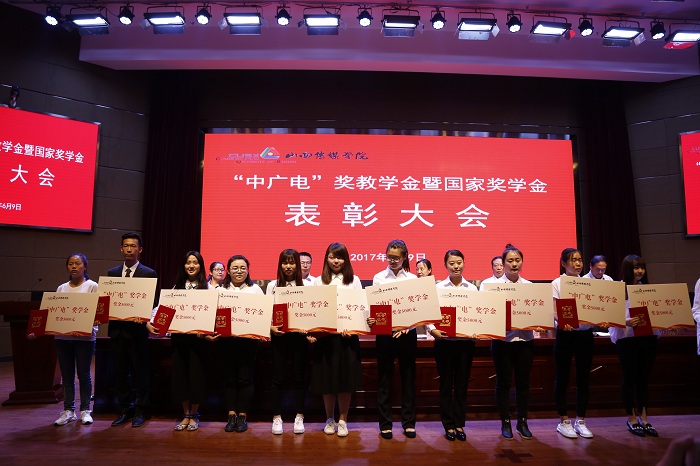 李熠星副书记、唐祎主任、张永德副校长、武升平副校长、郭卫东副校长分别为申明远等5位获得“中广电”奖教金的教师、徐聪等15名获得“中广电”奖学金的同学和高尔阔等10名获得“国家奖学金”的同学颁发证书并合影留念。