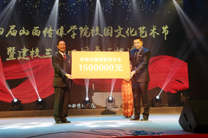 王建国校长代表学校接受了2001届毕业生黄飞为母校设立的翡俪文德奖教奖学金。