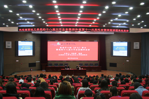 4月19日下午,学校举行党委中心组(扩大)学习暨党的十八届六中全会精神和省第十一次党代会精神宣讲。省高校工委党的十八届六中全会精神和省第十一次党代会精神宣讲团成员、太原理工大学马克思主义学院副院长刘振霞副教授来校宣讲。校党委书记张汉静,校长王建国,党委副书记王俊刚,党委副书记刘锐,副校长武升平,校领导梁云阶,学院办公室、宣传部、纪检监察室、学工部、工会、团委主要负责人等党委中心组成员,全体党员、入党积极分子,科级以上干部及思政部全体教师参加学习。学习由党委副书记刘锐主持。