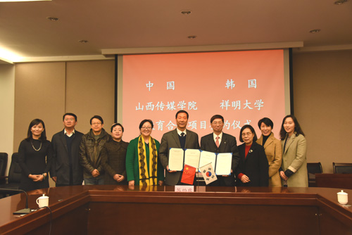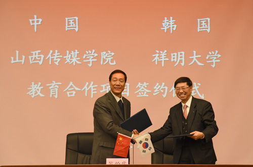 王建国校长与丘冀宪校长分别代表双方学校签订了《中国山西传媒学院与韩国祥明大学教育合作项目协议书》