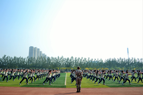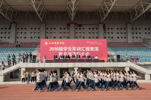 张汉静书记与炳重庆指导员检阅了2016级新生。随后,2016级新生从迎校旗、阅兵式、分列式、队列表演、军体拳表演、教官表演、送校旗、唱军歌等8个部分,汇报了此次的军训成果。