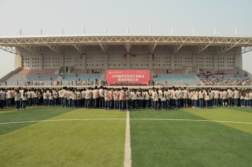9月29日,2016级新生军训汇报表演暨总结表彰大会在风雨操场举行。党委书记张汉静、校长王建国、党委副书记刘锐、副校长张永德、副校长武升平、校领导梁云阶、承训部队指导员炳重庆出席,副校长郭卫东主持大会。学院办公室、教务处、学生处、基础部、思政部、公体部负责人,各系主任、党总支书记,承担军训任务部队官兵和2016级全体新生参加。