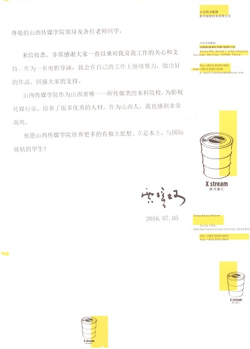 贾樟柯导演在回信中感谢我校的关心和支持,肯定了我校在人才培养方面取得的成绩,他表示,作为一名电影导演,他会在工作上继续努力,做出好的作品,回报大家的支持。最后,他祝愿山西传媒学院能够培养出更多优秀的传媒人才。