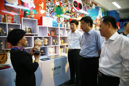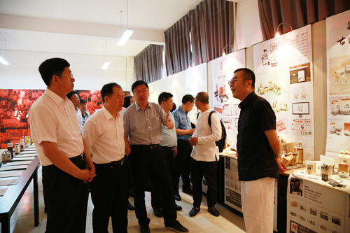 座谈会前,张汉静书记与卫明喜书记、曹治胜县长、梁伟山董事长一同参观了“品牌良方”学生作品展和文化科技园。