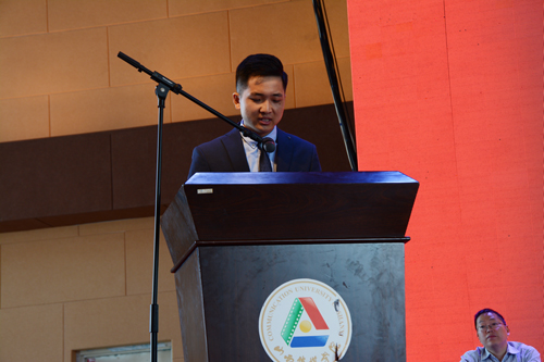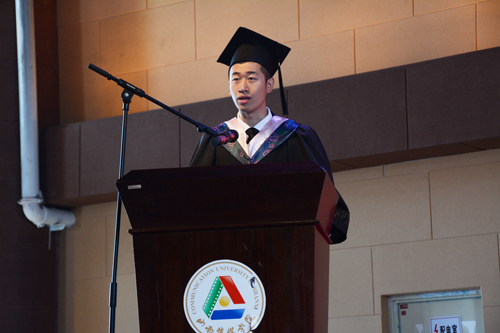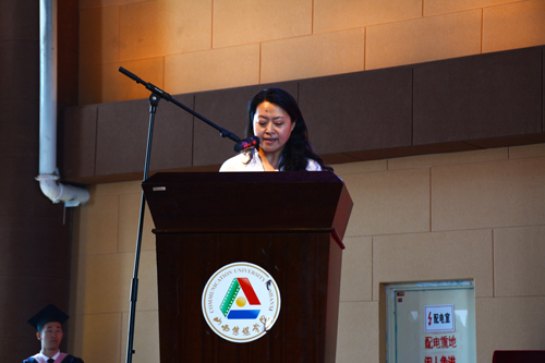 王俊刚副书记宣布了2016届本科毕业生毕业、结业情况。教师代表戏剧影视文学专业(动画方向)姚桂萍、毕业生代表2012级编导本科班芦鹏宇、在校生代表2013级播音1班彭晨分别上台发言。