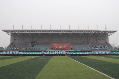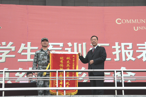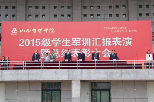 9月28日,学院在风雨操场举行2015级新生军训汇报表演暨总结表彰大会。党委书记张汉静、院长王建国、承训部队工化营教导员赵伟少校、党委副书记王俊刚、纪委书记梁云阶出席,副院长王新塘主持大会。学院办公室、教务处、学生处、基础部、思政部、公体部负责人,各系主任、党总支书记,承担军训任务的部队官兵和2015级全体新生参加。王建国院长代表学院向承训部队赠送了锦旗,感谢承训部队全体教官克服困难、努力搞好军训工作。
