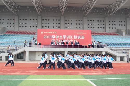 军训汇报表演中,2015级新生从迎校旗、阅兵式、分列式、队列表演、军体拳表演、学生应急防护自救表演、教官表演、送校旗、唱军歌等9个部分,汇报了此次的军训成果,表演高潮迭起,现场不时响起热烈掌声。