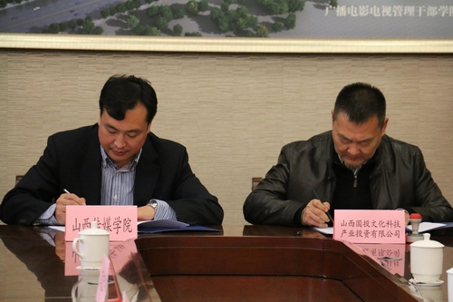 10月28日上午,我院与山西国投文化科技产业投资有限公司合作签约仪式在学院第二会议室举行。学院副院长武升平,山西国投文化科技产业投资有限公司董事长赵爱贵、总经理杜学武、艺术总监郭永平等出席签约仪式,学院办公室、财务处、宣传部负责人参加。学生处处长赵海涛主持仪式,并代表学院与山西国投文化科技产业投资有限公司代表就合作项目签约。