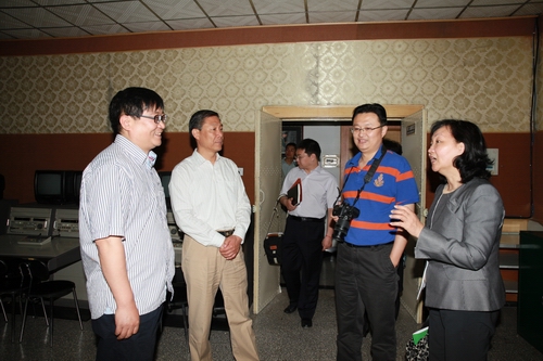 杨茜萍书记一行对学院影视制作中心进行实地考察,先后参观了录音棚、二维动画制作实验室、摄像机库、非线性编辑室、导播控制室、第一演播厅、高清转播车等,就学院正在录制的国家级非物质文化遗产《太谷秧歌》和与中国大学生体育协会的合作项目“留动中国——在华留学生阳光运动文化之旅”、“阳光体育”、“中国学生体育网络电视台”等项目进展情况、合作模式进行交流探讨。
